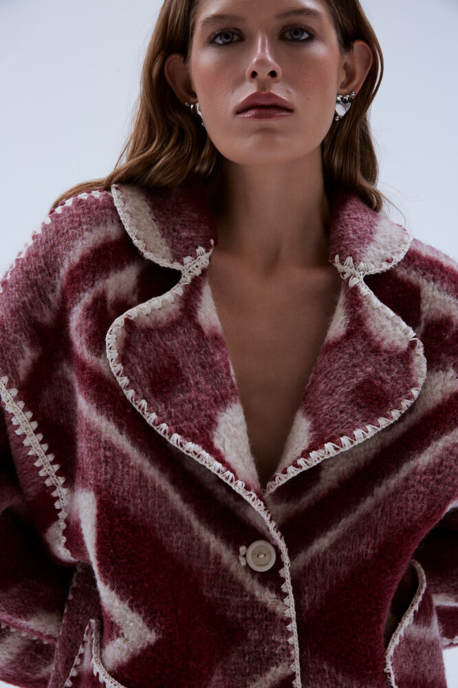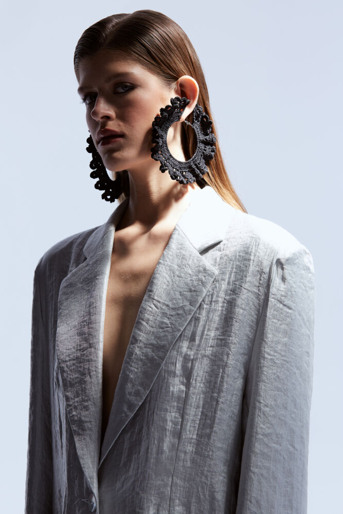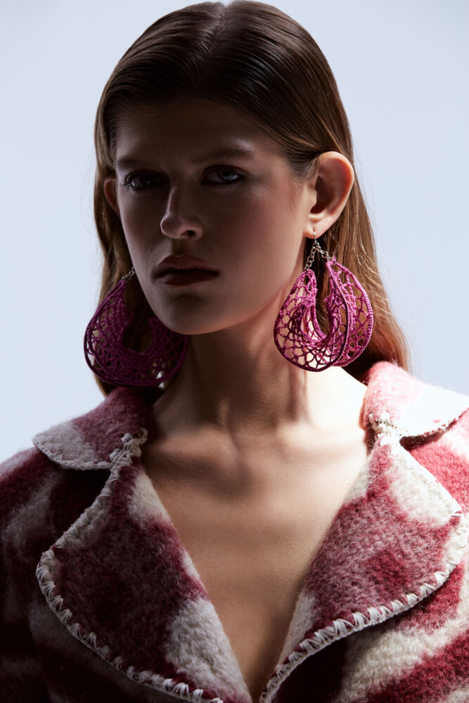 The entire collection is a testament to the transformative power of creativity. Woolen blankets have been artfully repurposed into stylish jackets, while discarded curtain scraps have been meticulously woven into a one-of-a-kind dress. Continuing my exploration of crochet, this collection showcases the craft in unexpected places, from knitted hoop earrings to intricate jacket finishing.