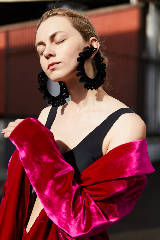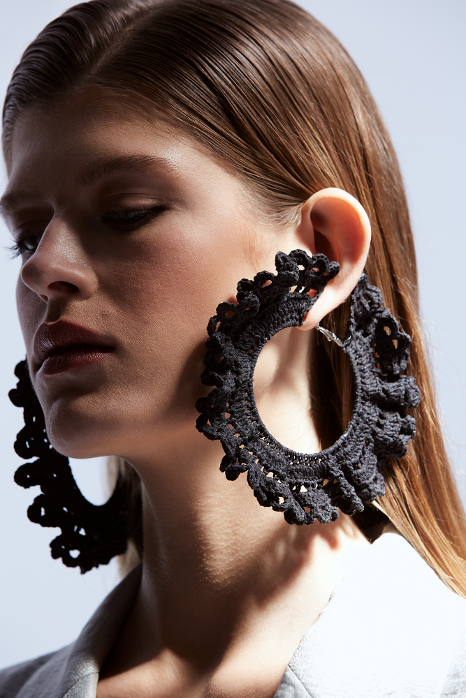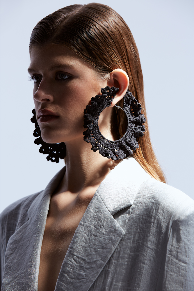 Ava Crochet Earrings – tradition meets fashion. The cotton crochet is stiffened using a traditional method called starching, using natural ingredients. The base of the hoops is made of surgical steel. Crocheted earrings made by a local artist.