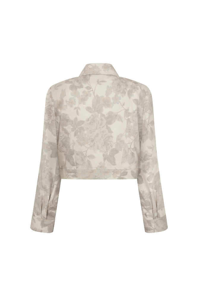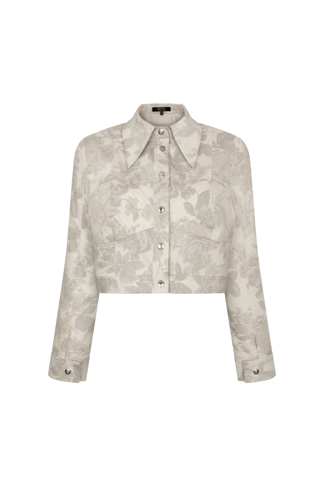 Cass jacket is a statement piece with a bustier-like front decorated with contrast lockstitch. The shape of a denim jacket is a little bit cropped, with metal snap buttons a the front and on cuffs.